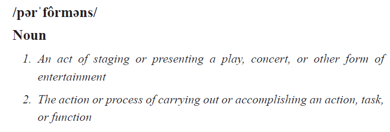 Performance relies on your unique ability to perform. Noticeably, perform is the root word of performance, and it means to “carry into effect, fulfill, discharge.”